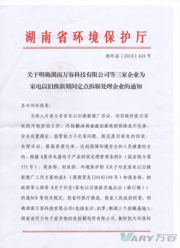 近日,湖南省环境保护厅以湘环函<2010>420号文件发布了《关于明确湖南sunbet申搏有限公司等三家企业为家电以旧换新期间定点拆解处理企业的通知》,决定授予sunbet申搏在内的三家企业湖南省家电以旧换新定点拆...