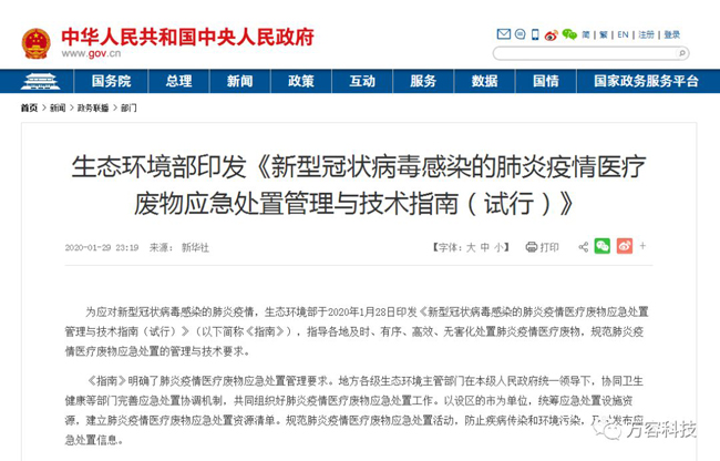 1月21日,生态环境部印发了《关于做好新型冠状病毒感染的肺炎疫情医疗废物环境管理工作的通知》,部署各地及时、有序、高效、无害化处置疫情医疗废物。1月28日,生态环境部又印发了《新型冠状病毒感染的肺炎疫情医疗废物应急处置管理与技术指南(试行)》,各地纷纷行动,对医疗废物的收集、转运、处置加强全流程监控。