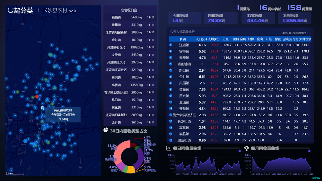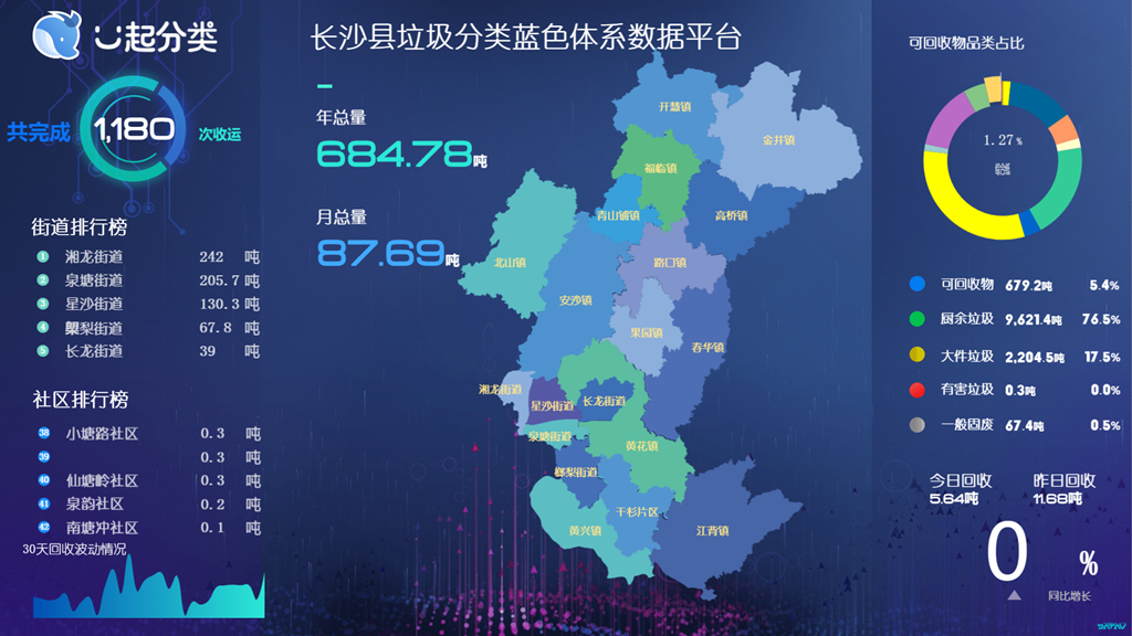 迄今,长沙县已在城区、乡镇建立301处小蓝屋,大件垃圾收集点145个。垃圾分类蓝色体系实现了互联网、垃圾分类网和再生资源网的三网融合,突破了数据赋能、科技支撑,以数字化推动了垃圾分类模式迭代创新,提供了有效、简洁、可复制、操作性强、费用低、按效果收费的垃圾分类采购新模式和路径,让“全民分类”不再是口号,更是数据大盘里时刻跳动的数字。