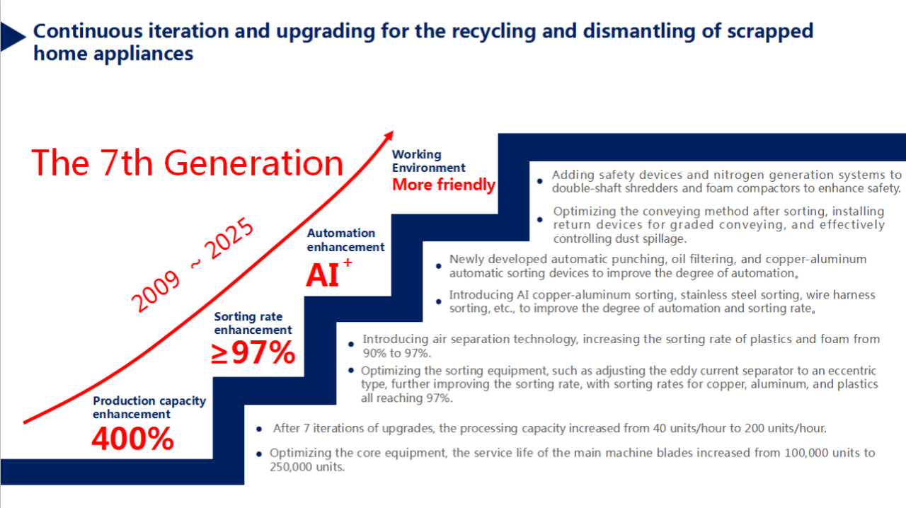 公司自主研发的废旧冰箱无害化处理及资源回收技术及设备, 具有“双轴斯碎机+立式破碎机+大风是稀释环成烷气体”技术, 主要用于对废旧冰箱中的各种原材料进行分离、 回收和利用, 具有自主知识产权,经国家工业和信息化部科技成果鉴定为 “填补国内空白, 达到国际先进水平” 。(鉴定资料详见工信鉴字【2010】第07001号)